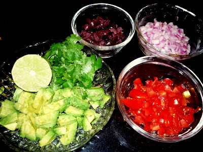 Either on a cutting board or in your food processor, chop the mushroom, red bell pepper, red onion, and jalapeno. Add this to the bowl.